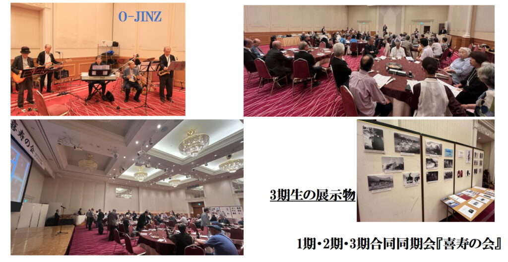 先ずは1期生・2期生中心で構成されたバンドO-JINZの演奏に迎えられて会場へ、参加者全員で記念写真を撮り、各期ごとの円卓テーブルに着席、そして残念ながら参加したくとも参加出来なかった故人への「黙祷!」から会がスタート致しました。開会、同窓会長、1期生の挨拶と続き、3期生の乾杯の音頭で宴が始まりO-JINZの青春時代の懐かしい曲のバンド演奏が始まり、それぞれのテーブルで食事をしながらの歓談タイム・・・。